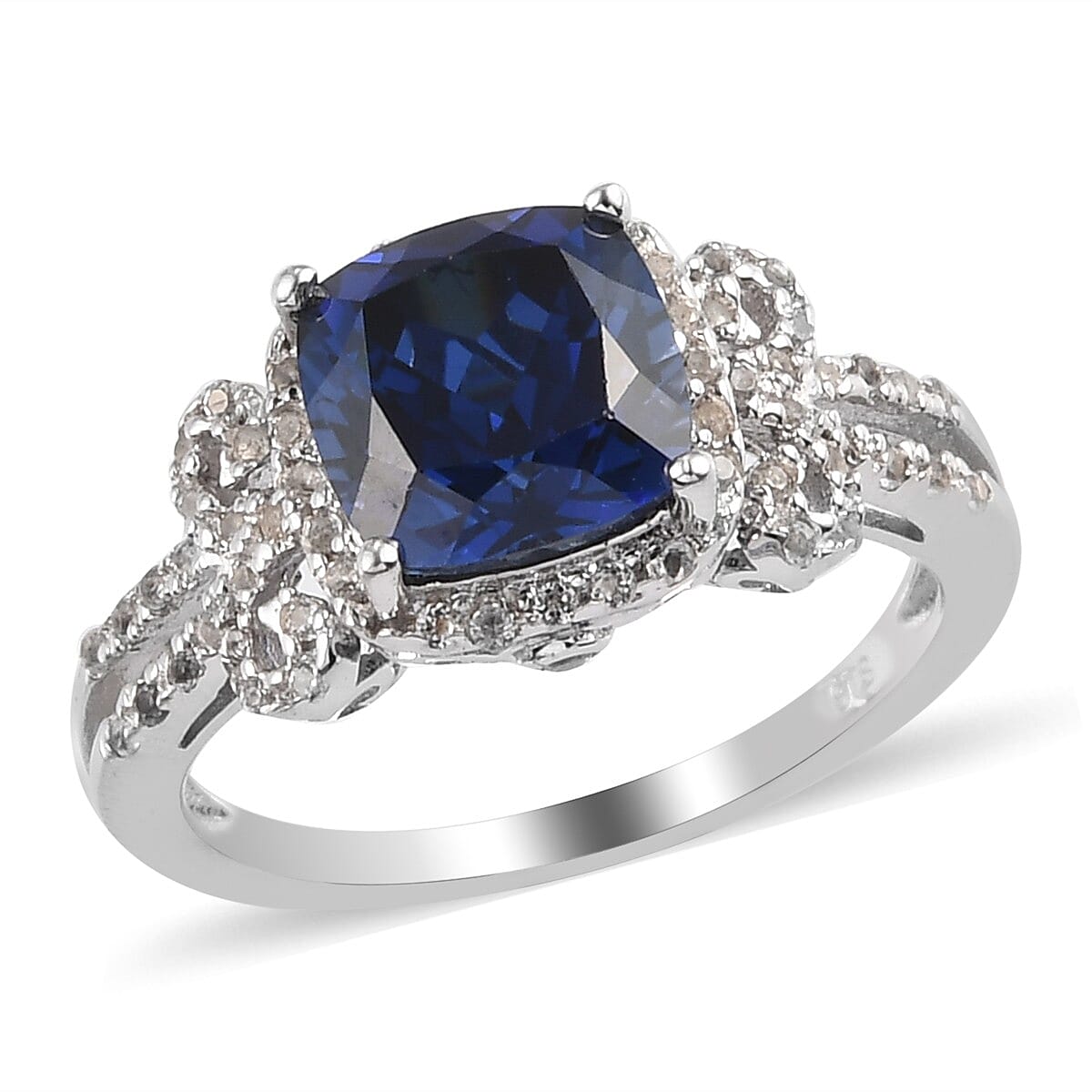 Lab Created Blue Sapphire and Zircon Ring in Platinum Over Sterling Silver (Size 7.0)