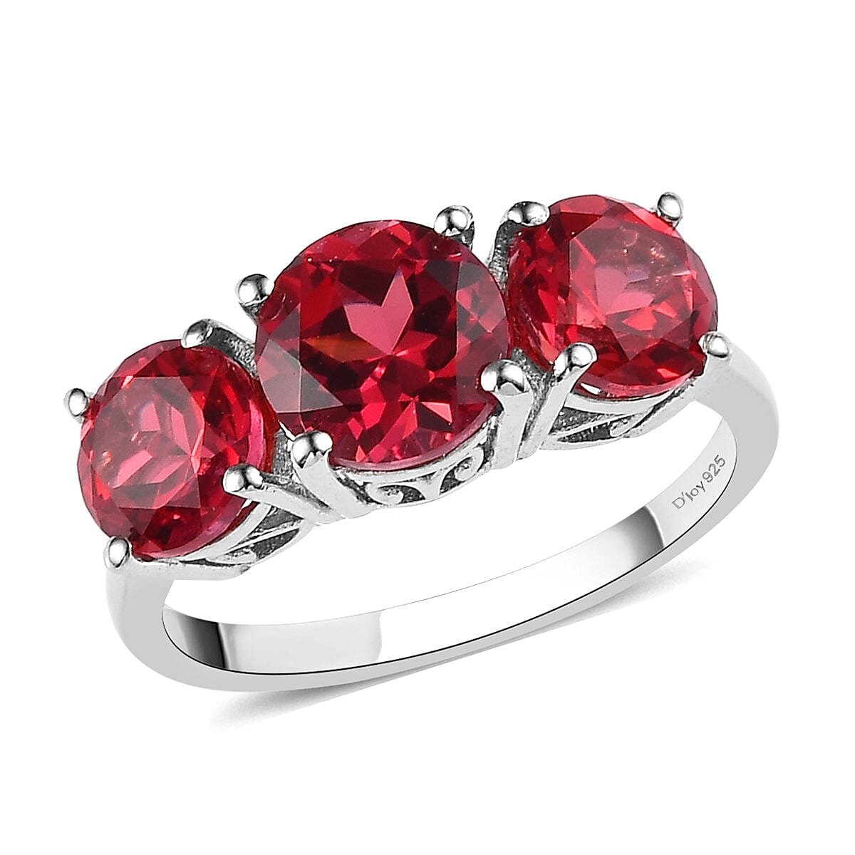 Inspired by the trilogy of time, this Lab Created Padparadscha Sapphire symbolizes the past, present, and future in a relationship. Trilogy rings are also popular as three-stone rings. These rings are in trend for their distinctive look compared to traditional engagement rings, thus making them perfect for modern fashion. Based on the same theme, this ring features three round gems on the front side of the band. Each gemstone is held firmly in prongs. The prong setting is a classic and elegant style that amplifies the brilliance and beauty of the center gem. Lab-created sapphire means a sapphire gem grown in a lab compared to the gems mined. Displaying the same chemical, optical and physical properties as natural stones, this lab-created sapphire features an orange-pink color reminiscent of the sacred Lotus flower. Crafted in sterling silver, this ring suits every outfit.
