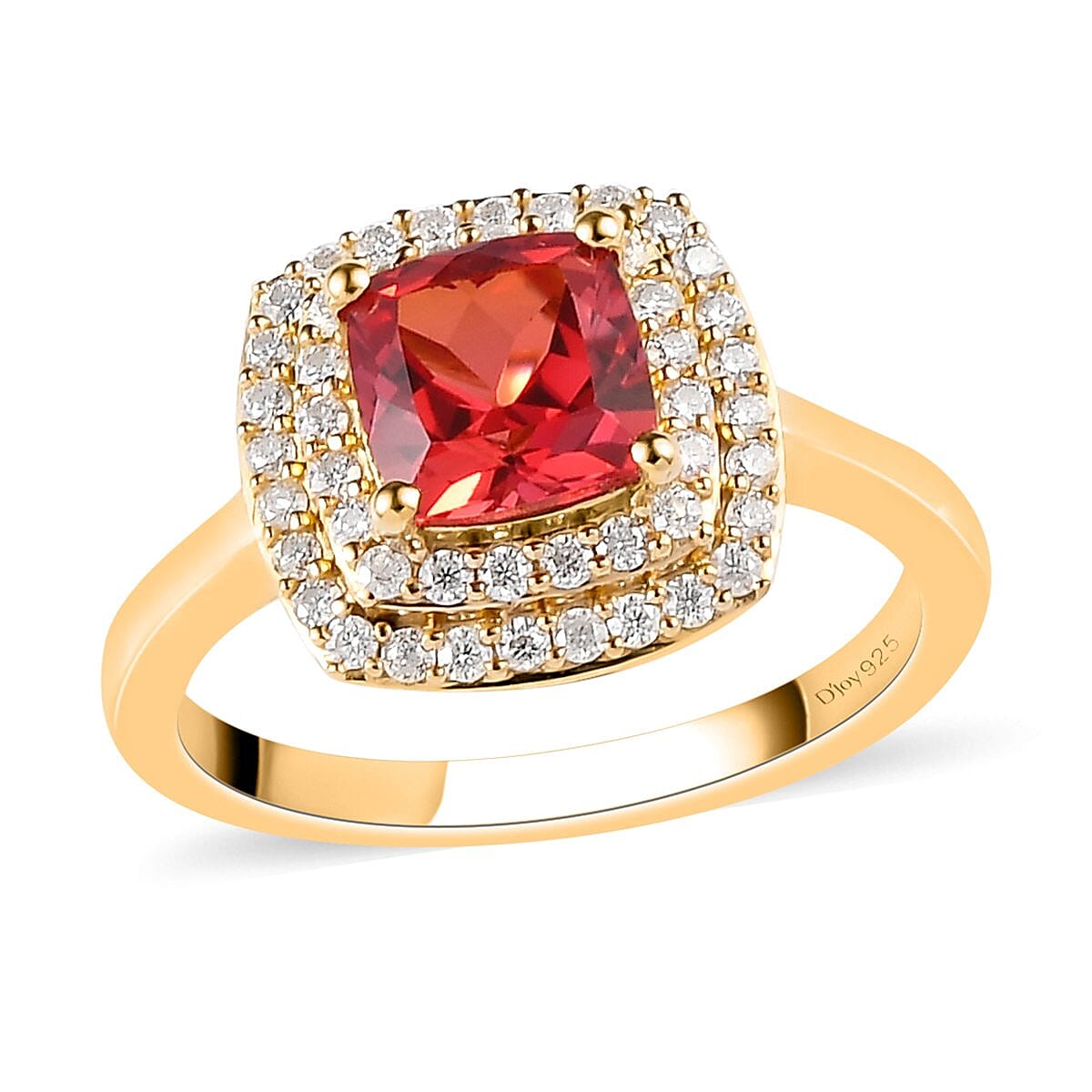 This lab-created Padparadscha sapphire ring is inspired by a double halo design. Halo engagement rings are timeless and the biggest trend that will never go off. These rings illuminate the beauty of the center gem, and with a double halo style, this adds an elegant look. With a beautifully hued gem in the center, this ring features a double halo of moissanite. Each gemstone is held firmly in prongs. The prong setting is a classic and elegant style that amplifies the brilliance and beauty of the center gem. The geometric frame that embraces the beauty of two stones gives a unique look. Lab-created sapphire means a sapphire gem grown in a lab compared to the gems mined. Displaying the same chemical, optical and physical properties as natural stones, this lab-created sapphire features an orange-pink color reminiscent of the sacred Lotus flower.β Crafted in sterling silver, this ring suits every outfit.