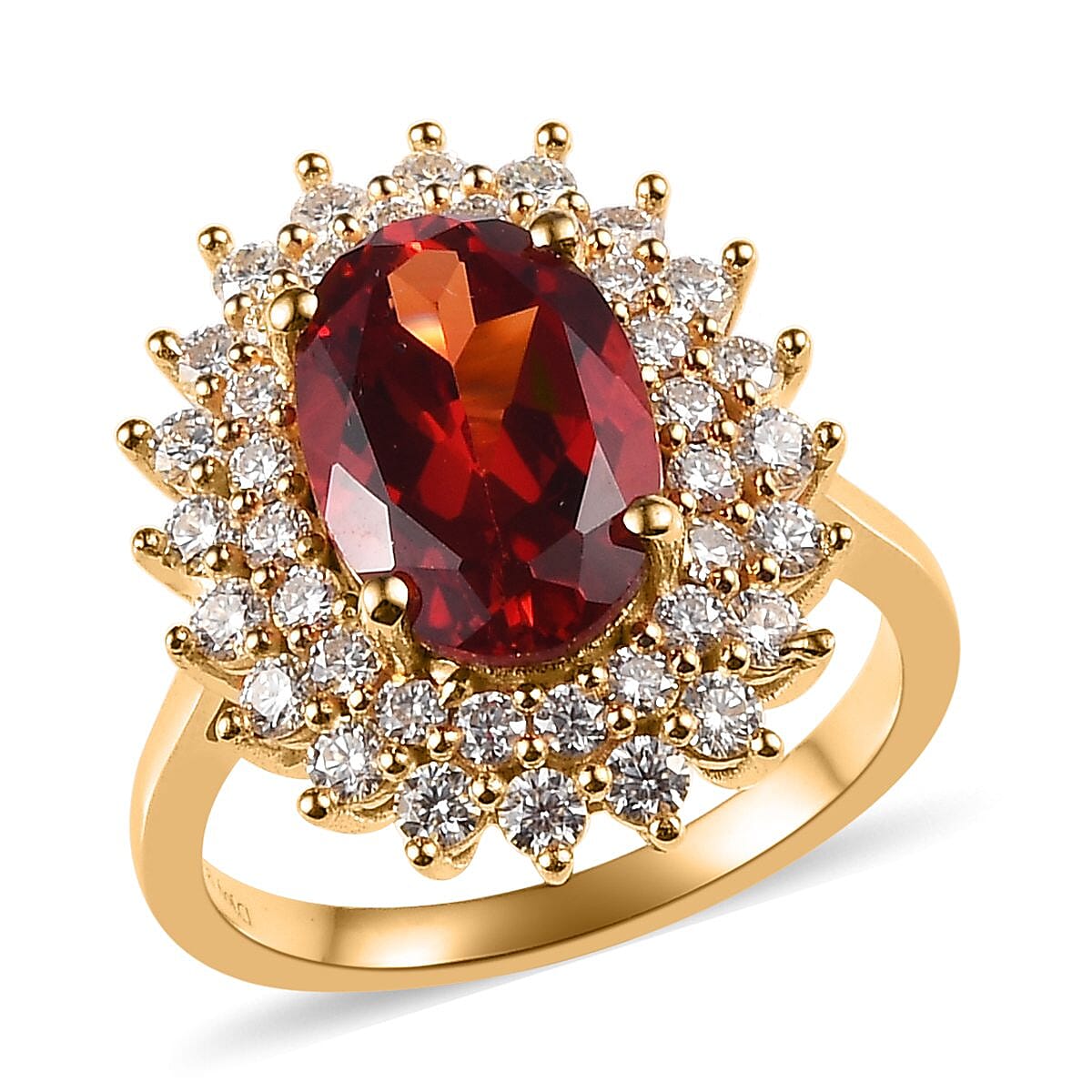 Lab Created Padparadscha Sapphire, Moissanite Double Halo Ring in Vermeil YG Over Sterling Silver (Size 10.0) 6.00 ctw