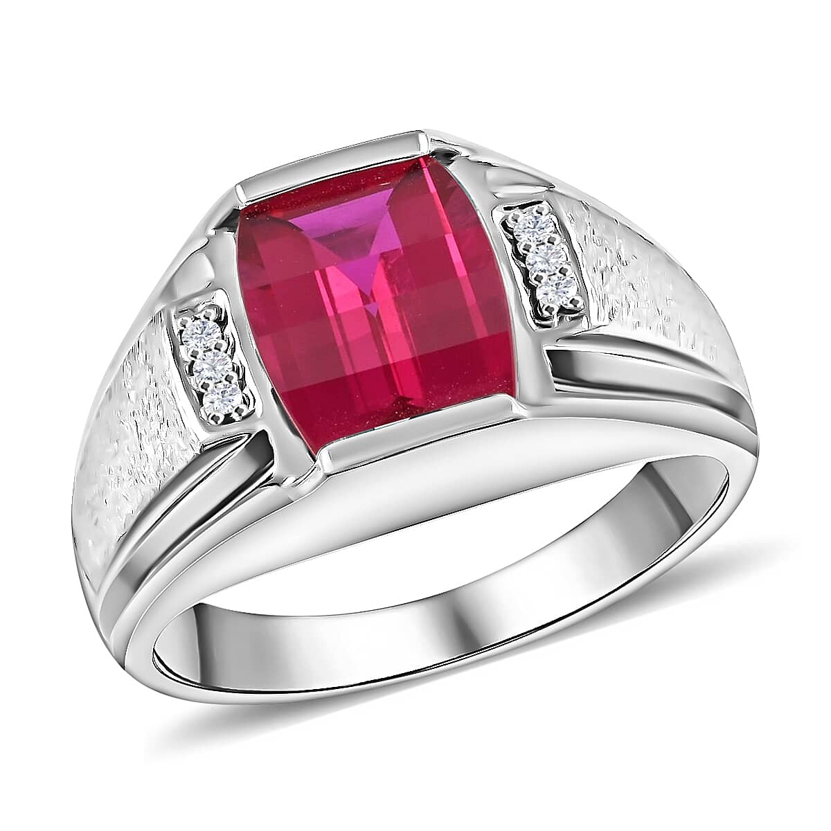 Lab Created Ruby Men's Ring, Diamond Accents Ring, Sterling Silver Men's Ring, Textured Ring (Size 10)