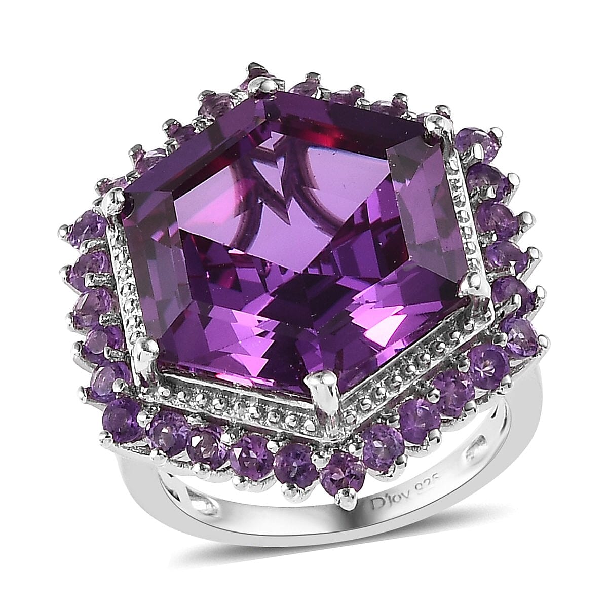 Indulge in the mesmerizing beauty of this lab-created color-change sapphire ring. This halo ring is a true masterpiece, showcasing an exquisite color change sapphire in the center. The halo of dazzling amethyst surrounds the center hexagon stone. The amethysts surrounding the center stone add an extra layer of sophistication and elegance, creating a perfect harmony between the two gemstones. The platinum over sterling silver band adds a touch of luxury and durability, making this halo engagement ring a timeless treasure that will withstand the test of time.