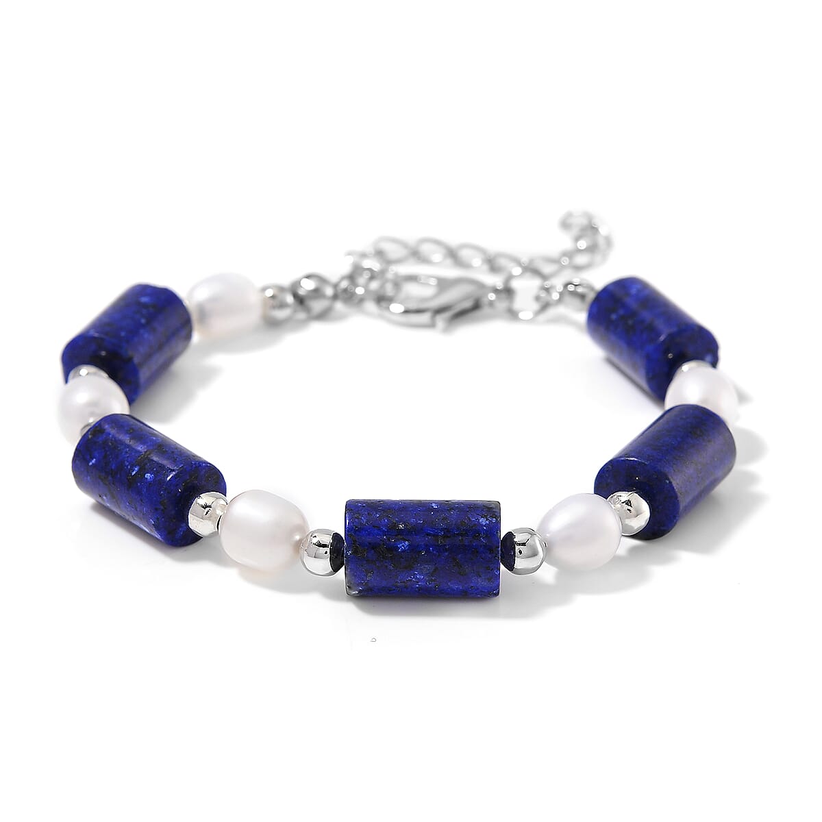 Lapis Lazuli 30.00 ctw and Freshwater Pearl Stretch Bracelet in Silvertone (6.50-8.50In)