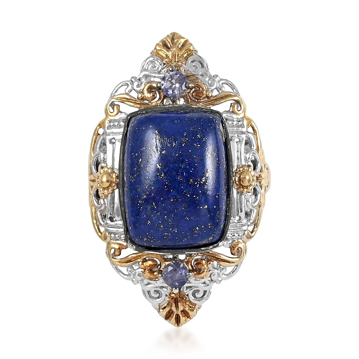 At the edge of astronomical twilight, dusk inspires the design of this lapis lazuli lapis lazuli and catalina loite ring. Cushion lapis lazuli is embellished in the center with Catalina lolite above and below the gemstone. The artisans have invested their time and energy to design this vibrant ring. This fashionable ring is crafted in sterling silver with platinum and vermeil yellow gold finish, complementing the soft blue hues. Lapis lazuli exudes brilliance as it holds the sheen of golden black on its surface. Intricate designs add intrinsic value to the gemstone.