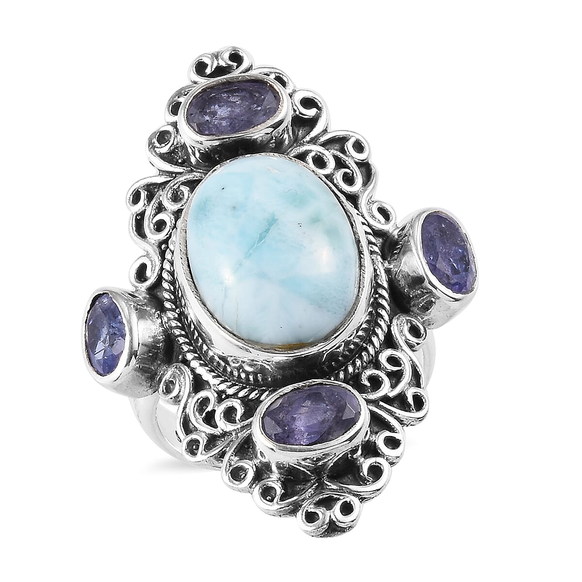 This larimar ring has an impressive beauty. The rare blue-hued gem in the center is set in a bezel and lined with an intricate rope pattern. The four Catalina Iolite rests on the bed of swirls symbolizing hope, freedom, love, and faith. Crafted in sterling silver, this ring has an amazing look with larimar as one of the most sought-after semi-precious gems with only one source of origin. Catalina Iolite is known for showing pleochroism thus also known as water sapphire. Both the gems combined define the beauty of this ring.