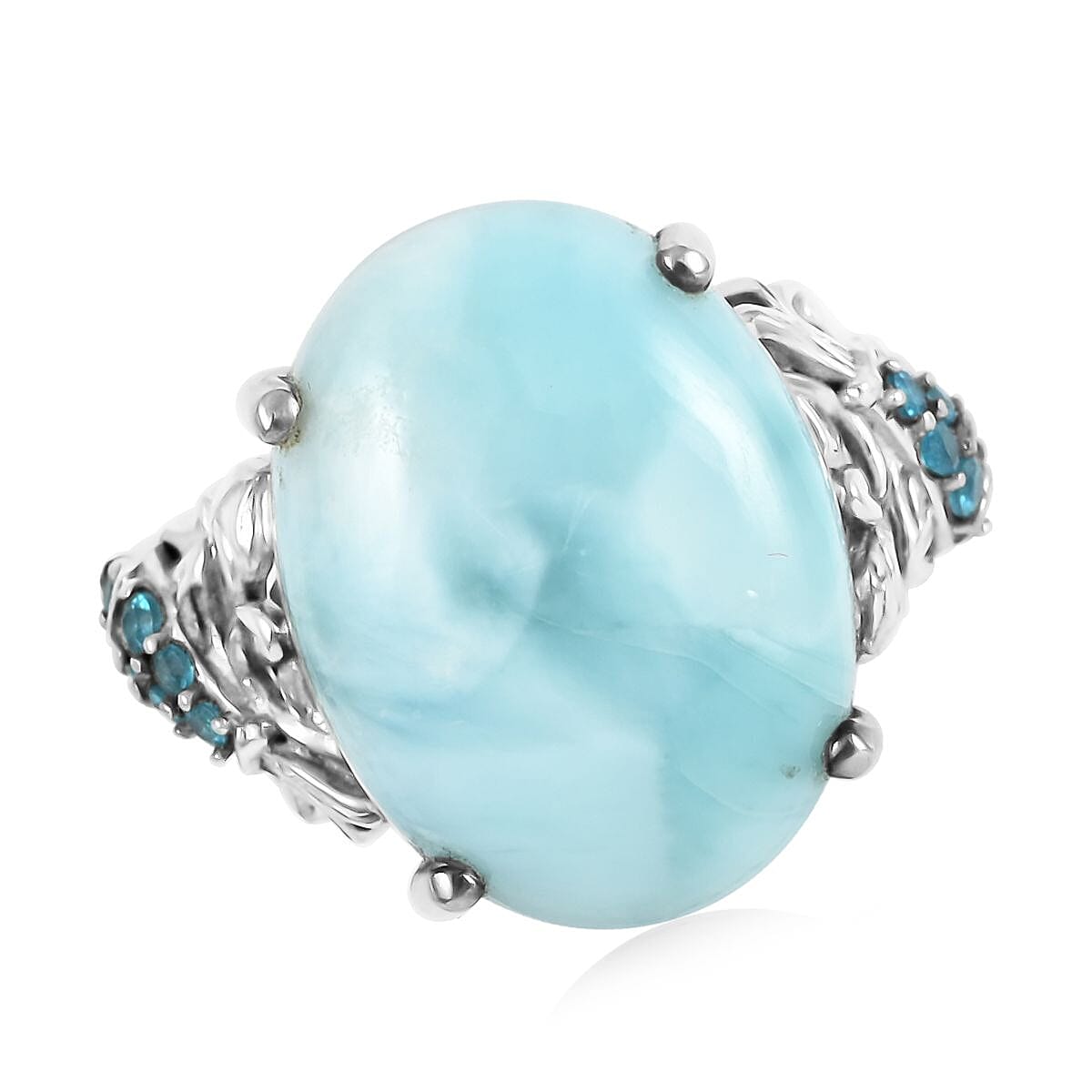 Inspired by the beauty of aquatic life, this larimar ring gives a beautiful look. This ring features an oval-shaped gem set beautifully in prongs safeguarding and intensifying the beauty. The beautiful aquatic life displayed on the shank with Malgache Neon Apatite studded fish motif represents rebirth and fertility and leaves add their freshness. A perfect combination of a nature-inspired and contemporary look, this ring is perfect for every occasion. Larimar is one of the most sought-after and rare semi-precious gems with only one source of origin. Crafted in sterling silver, this fashion ring is versatile and can be paired with any outfit.