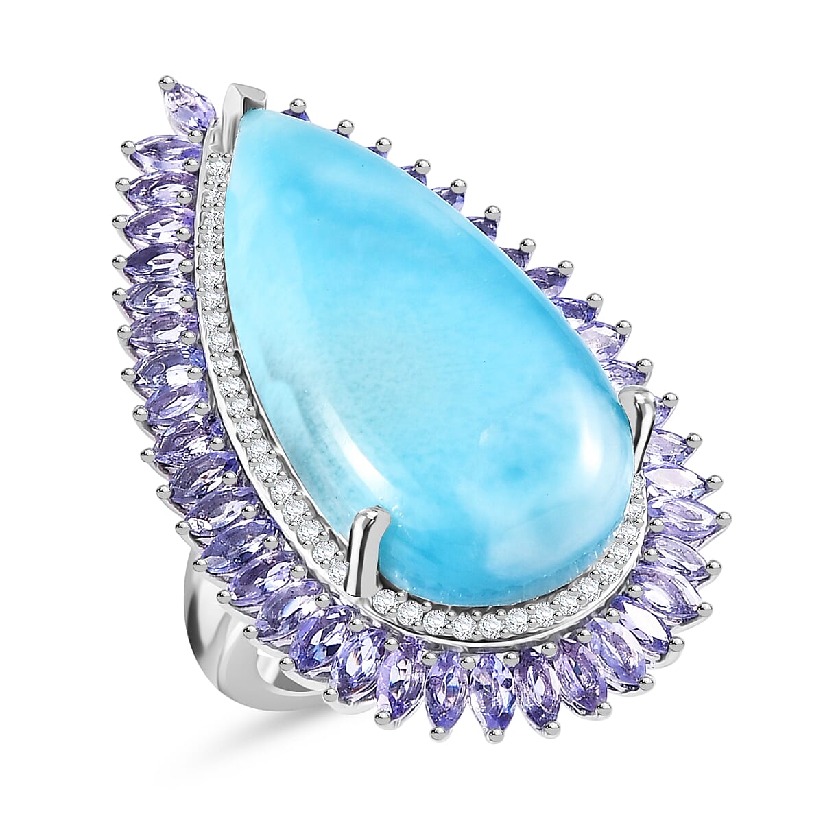 Elevate your style to a celestial realm with this captivating, super-sized larimar ring. Our double halo design, graced with multi gemstones and encased in platinum over sterling silver, promises to deliver an unending spectrum of sparkle. This isn't just jewelry, it's an enchanting testament of nature's beauty that’s always ready to mesmerize.