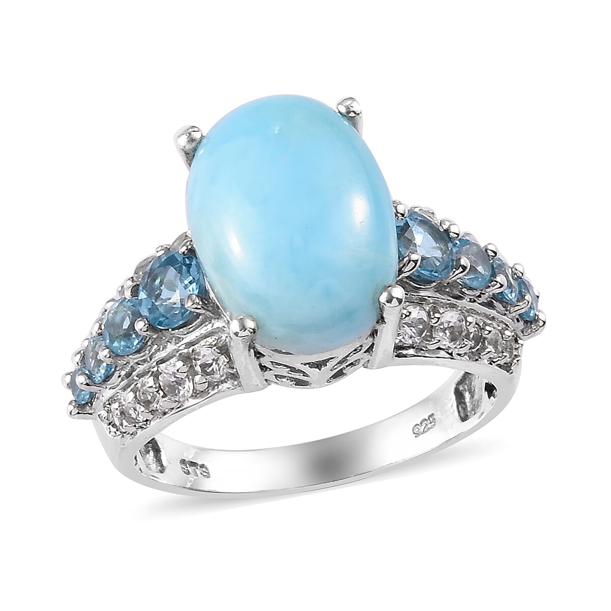 Inspired by a glacier, this larimar ring has the ecstasy of nature. The rare blue-hued gem in the center is held by four prongs and is supported by a London blue topaz that moves down the shank, the blue hue of which represents ocean water. The zircons that outline the shank give radiance to the piece. Crafted in sterling silver, this ring has an amazing look with one of the most sought-after semi-precious gems with only one source of origin.