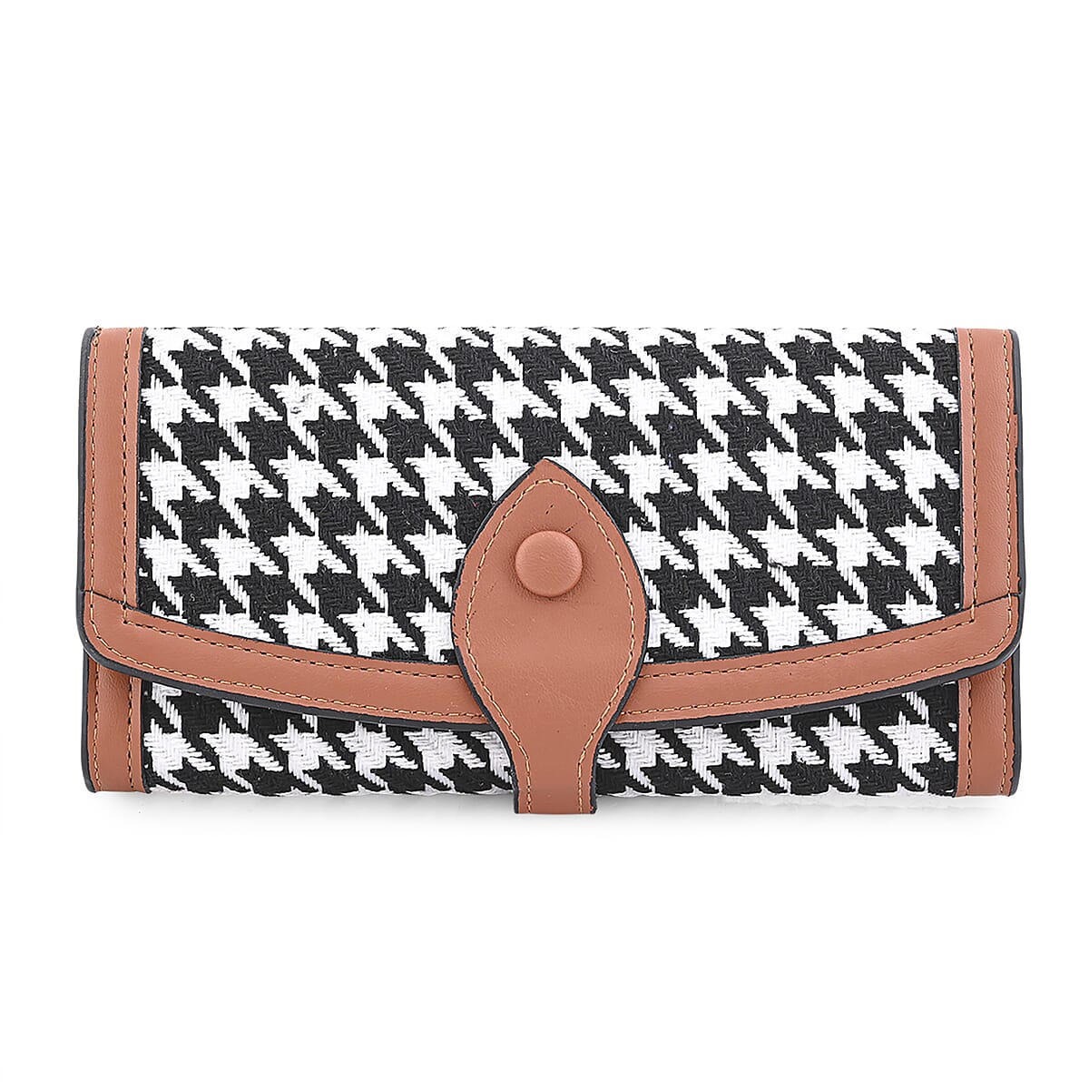 Upgrade your accessory collection with this houndstooth pattern wallet for effortless organization. This trendy faux leather wallet combines style and practicality. It secures essentials with a convenient flip button closure. The distinctive pattern adds sophistication to your personal style.