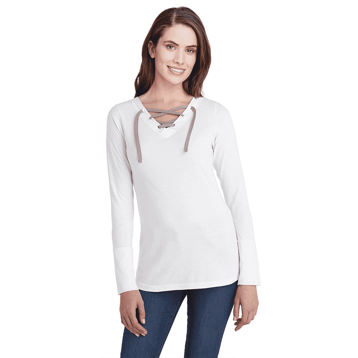 Refresh your wardrobe with the LAT long-sleeve lace-up tee for effortless style. This versatile long-sleeved tee offers comfort throughout your daily activities. The fine jersey material feels luxurious against your skin. It combines fashion and function for your active lifestyle.