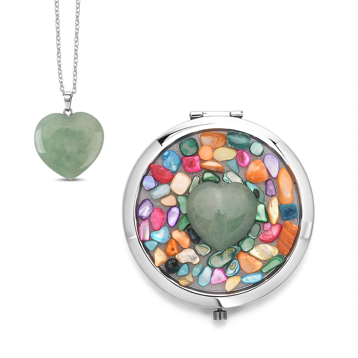 Livmore Green Cosmetic Gemstone Mirror with Matching Green Aventurine Heart Necklace (20 Inches) in Silvertone