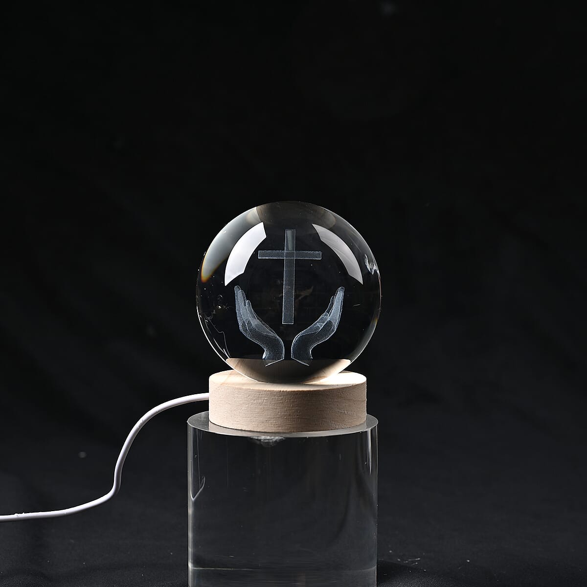 Livmore RGB Changing LED Light Crystal 3D Prayer Hands with Cross Engraved Pattern Glass Ball with Wood Base (Ball 3.5 Inches & Wood Dia 2.5 Inches)
