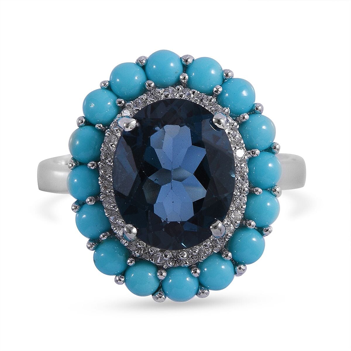 London Blue Topaz and Multi Gemstone Double Halo Ring in Platinum Over Sterling Silver (Size 8.0) 6.15 ctw
