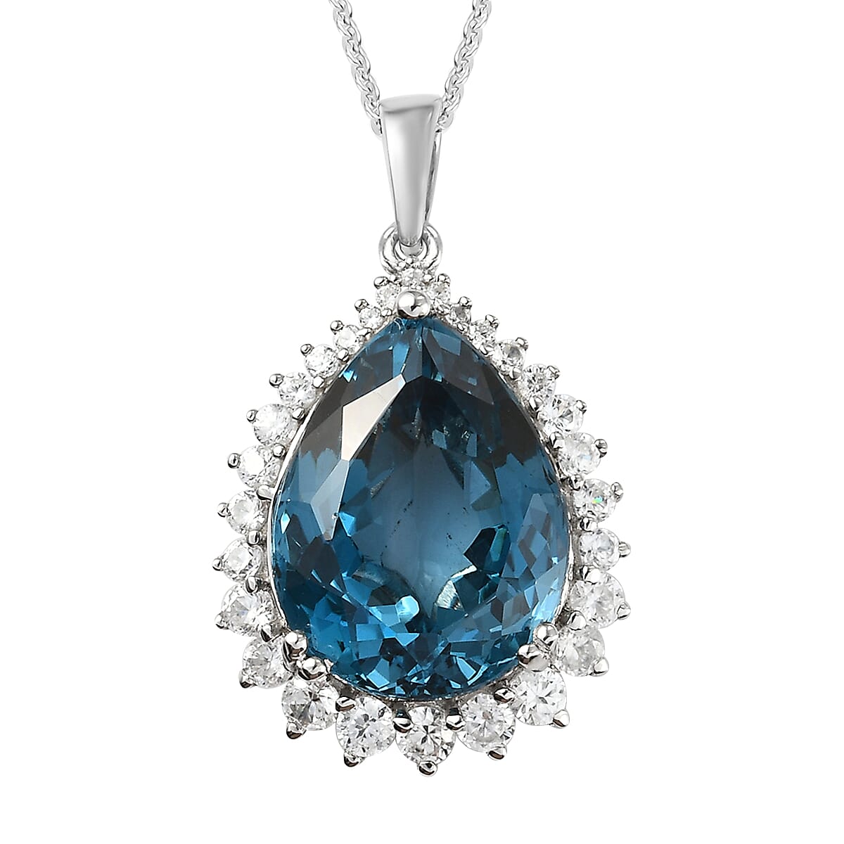 London Blue Topaz and Natural White Zircon Pendant Necklace 20 Inches in Platinum Over Sterling Silver 22.50 ctw