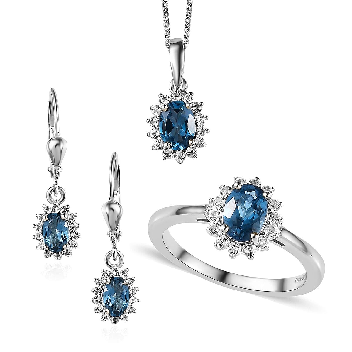 London Blue Topaz and White Topaz Lever Back Earrings, Sunburst Ring (Size 7.0) and Pendant Necklace 20 Inches in Platinum Over Sterling Silver 3.65 ctw