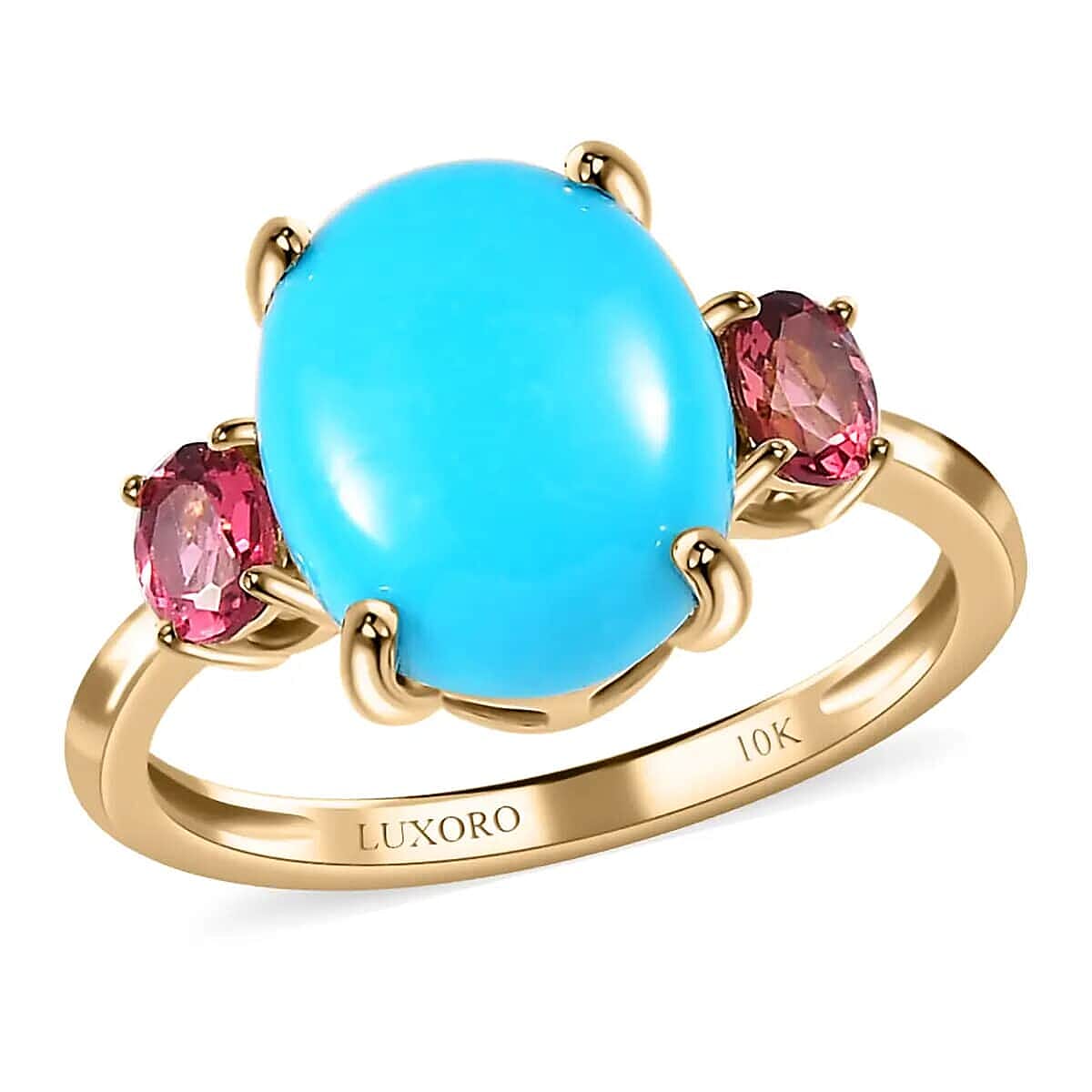 Luxoro AAA Sleeping Beauty Turquoise Ring, Ouro Fino Rubellite Accent Ring, 3 Stone Ring, Trilogy Ring, 10K Yellow Gold Ring 3.60 ctw