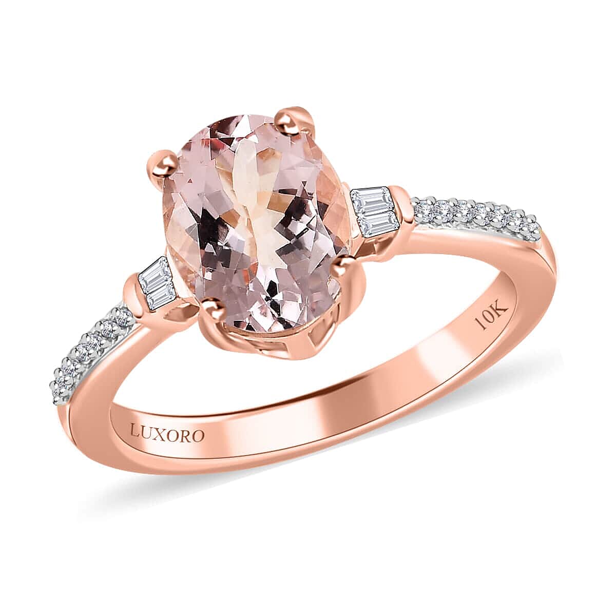 Embrace love and valor with the Luxoro premium pink morganite ring. An oval gemstone is poised in four prongs, embraced by diamond baguettes, and set in 10K rose gold - a ring of romance and courage. A piece from our Luxoro Collection, it's more than jewelry; it's your heart's hero.