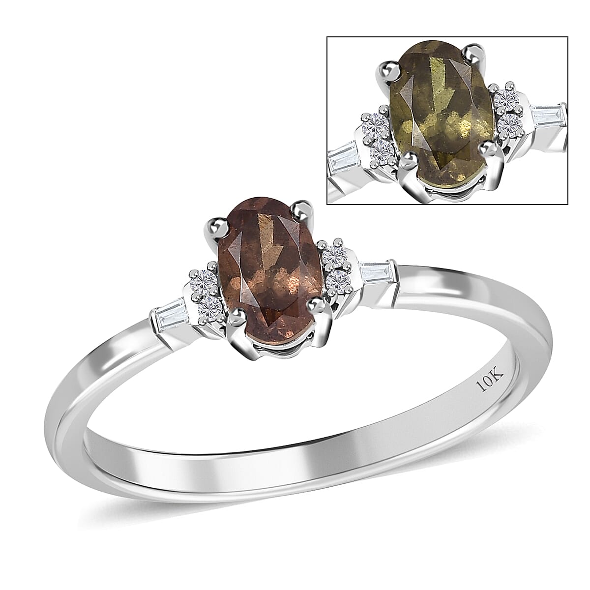 Fall in love with this Bekily color-change garnet ring. This breathtaking ring features an oval-shaped garnet that changes color under different lighting conditions. The sparkling round diamonds on the shoulders are followed by baguette diamonds, adding a touch of glamour and luxury to this magnificent piece of jewelry. Crafted in 10K white gold, this fashion ring will make you feel like a sovereign.