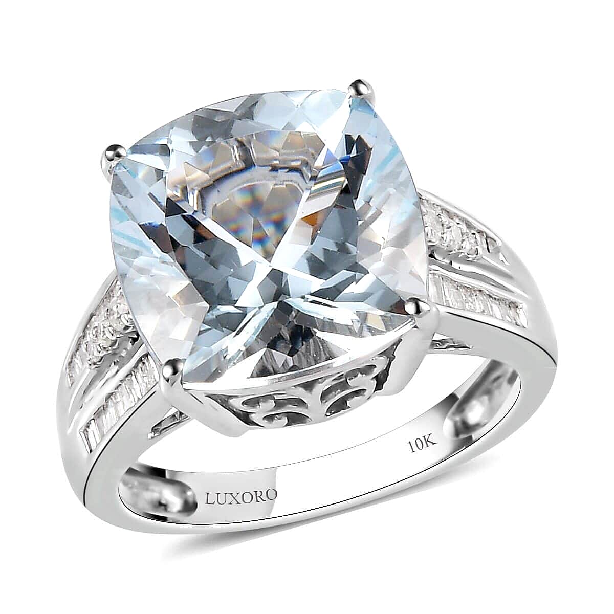 Featuring a prong-set cushion-shaped aquamarine at its heart, the 10K white gold premium Mangoro aquamarine and diamond ring elegantly combines sophistication with timeless beauty. Adorned with diamonds along the shank and intricate scrollwork beneath the bridge, this aquamarine ring showcases meticulous craftsmanship and attention to detail.