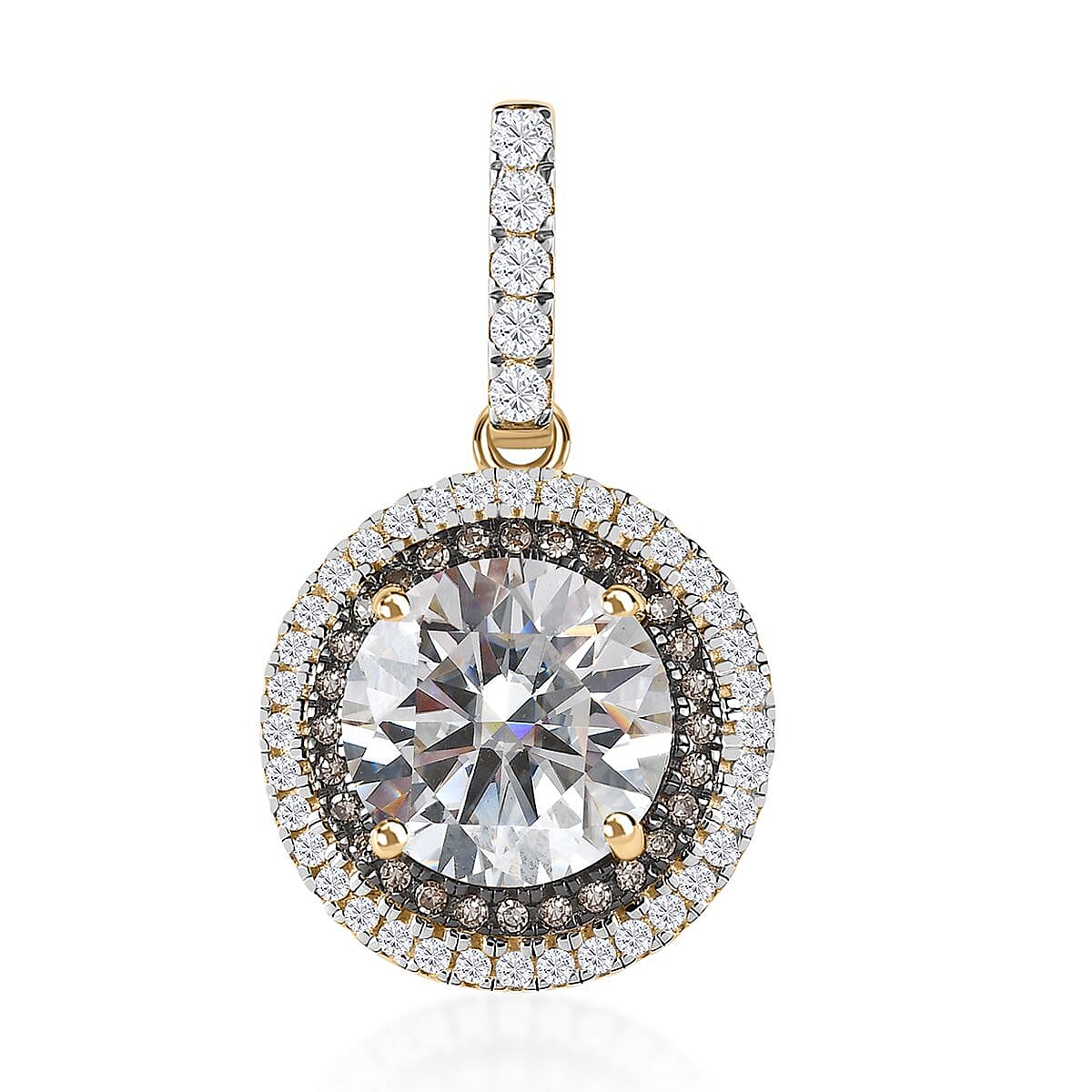 Exude radiant confidence with this moissanite and natural champagne diamond double halo pendant. This pendant tempts the eye with a mesmerizing moissanite centerpiece, renowned for its brilliant fire and sparkle. Surrounding the moissanite, a committed double halo of natural champagne diamonds offers an empowering contrast with their warm, golden tones. This powerful piece is a testament to sophisticated style and is a trustworthy symbol of luxury and refinement.