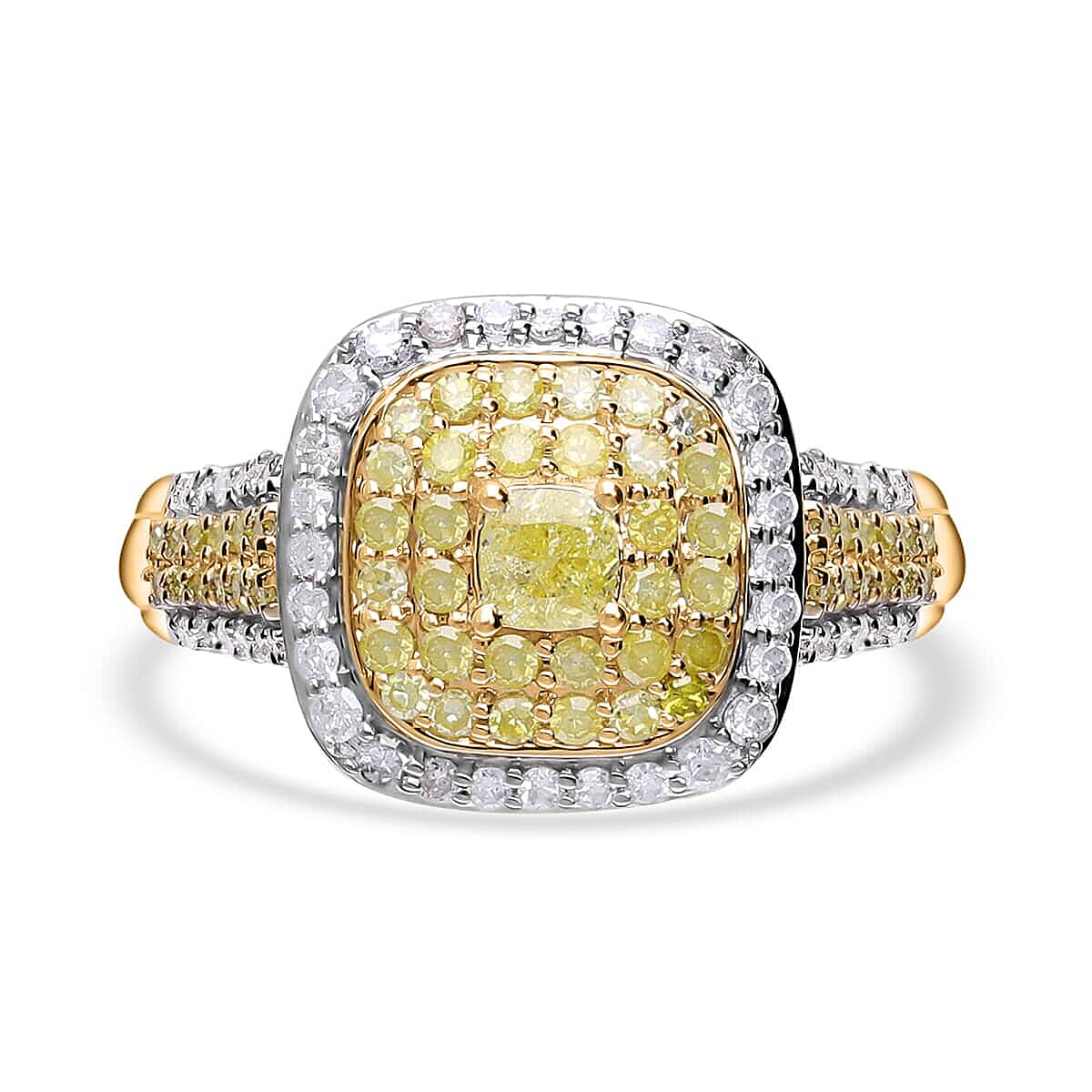 This natural yellow and white diamond cluster ring is elegantly set in 10K yellow gold. It showcases a stunning arrangement of natural yellow diamonds surrounded by sparkling white diamonds. This combination enhances the vividness of the yellow diamonds, creating a captivating visual contrast. Skillfully crafted, this gold ring melds the rich glow of yellow gold with the brilliance of diamonds, offering a luxurious and eye-catching accessory.