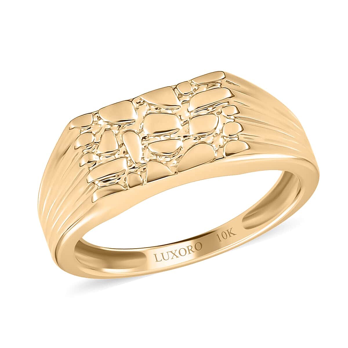 Introducing the Luxoro 10K yellow gold nugget men's ring, a true symbol of style and masculinity. Crafted with precision, this ring features a captivating nugget texture on the front, adding a touch of rugged charm. The broad shank enhances the ring's bold and substantial presence. Made from high-quality 10K yellow gold, this ring from the Luxoro Collection is a timeless accessory that exudes confidence and sophistication.