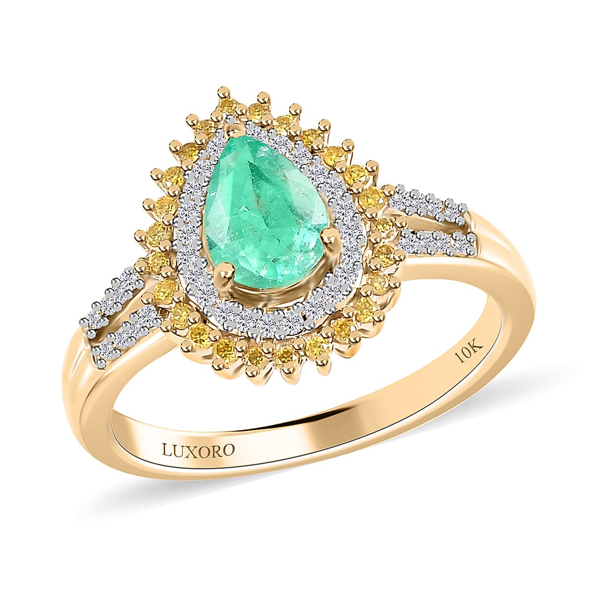 Luxoro 10K Yellow Gold Premium Boyaca Colombian Emerald and Moissanite, I3 Natural Yellow Diamond Double Halo Ring (Size 7.0) 1.00 ctw