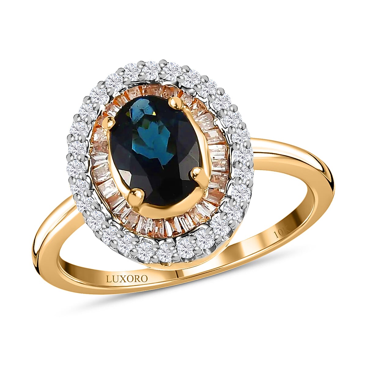 Inspired by a double halo design, this Monte Belo Indicolite ring symbolizes sanctity and perfection. Halo rings have been popular throughout history for their uniqueness in illuminating the gemstone in the center. This ring features an oval-shaped premium gem in the center held by prongs safeguarding and intensifying the beauty. The array of baguette-shaped white diamonds that shine around the center gem makes the entire piece radiate its divine and luxurious halo look. To finish with, the round sparkling diamonds arrange around the center design give a double halo appearance. The double halo style adds an edgy look to traditional styles making the rings go well with contemporary fashion. This ring from Luxoro Collection is crafted in 10K yellow gold. Indicolite is famous for its rare hue. It is also pleochroic in nature and appears different when viewed from different angles, making this ring gain a mesmerizing look. This October birthstone has a perfect hardness, thus making this ring suitable for daily wear.