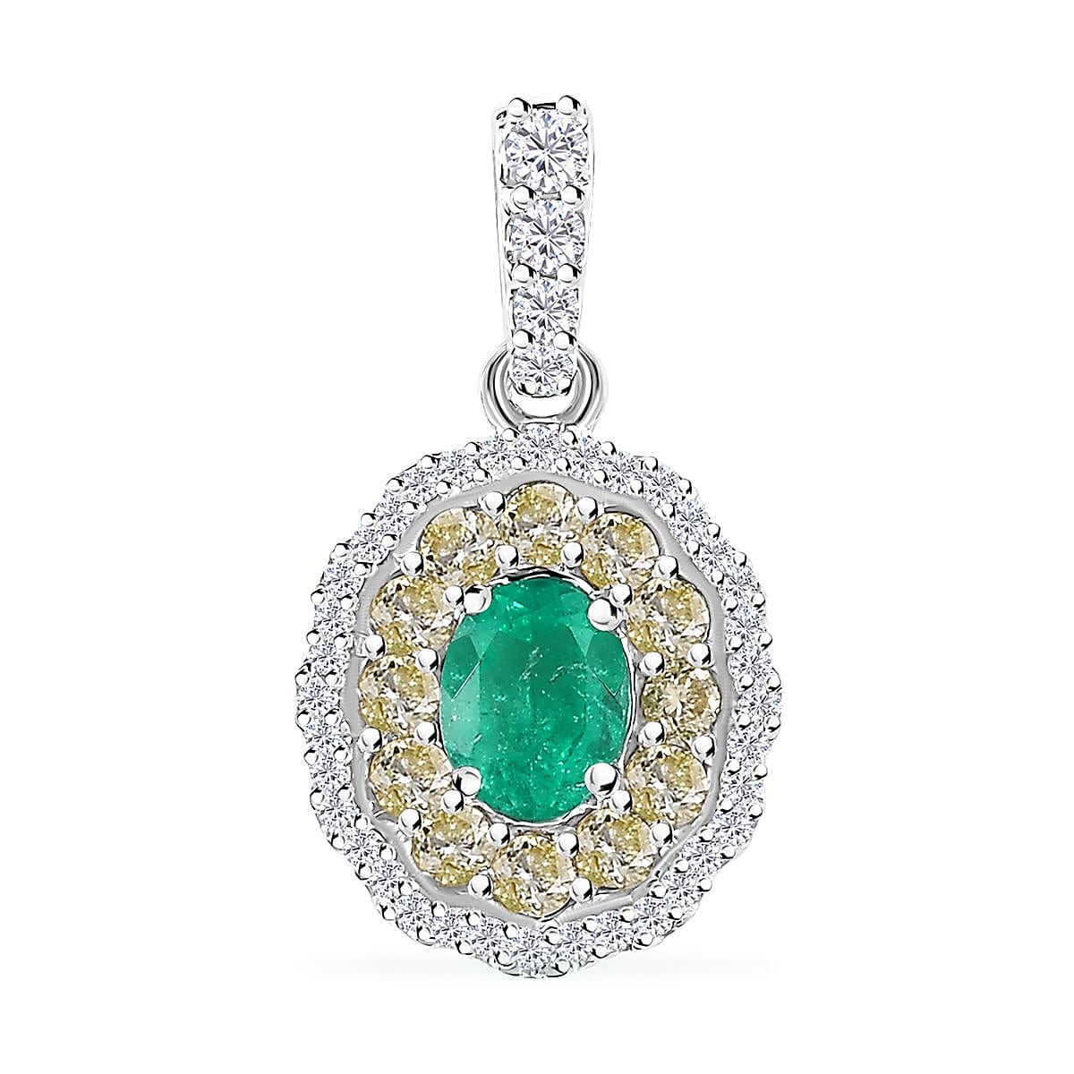 Luxoro 14K White Gold AAA Boyaca Colombian Emerald, I2 Natural Yellow and White Diamond Double Halo Pendant 1.00 ctw