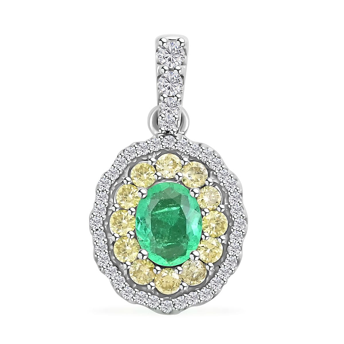 Luxoro 14K White Gold AAA Boyaca Colombian Emerald, I2 Natural Yellow and White Diamond Double Halo Pendant 1.00 ctw