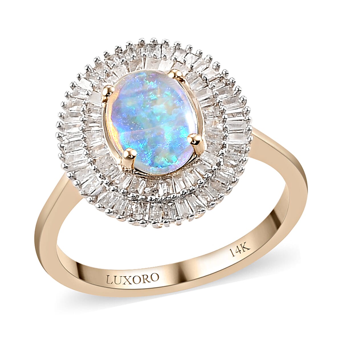 Crafted from 14K yellow gold, this opal ring features a prong-set oval-shaped AAA Australian Lightning Ridge black opal at its center, encircled by a double halo of diamonds. The opal, renowned for its mesmerizing play-of-color, is securely set amidst a dazzling array of diamonds, adding brilliance and sophistication to this elegant piece.