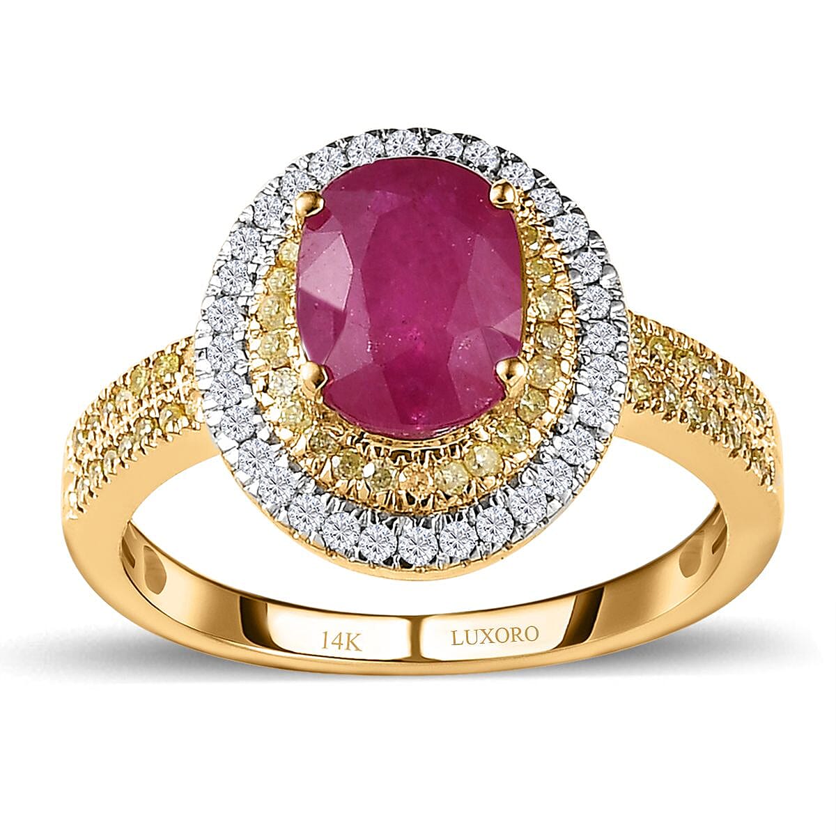 Luxoro 14K Yellow Gold AAA Montepuez Ruby, I2-I3 Natural Yellow and White Diamond Double Halo Ring (Size 10.0) 1.90 ctw