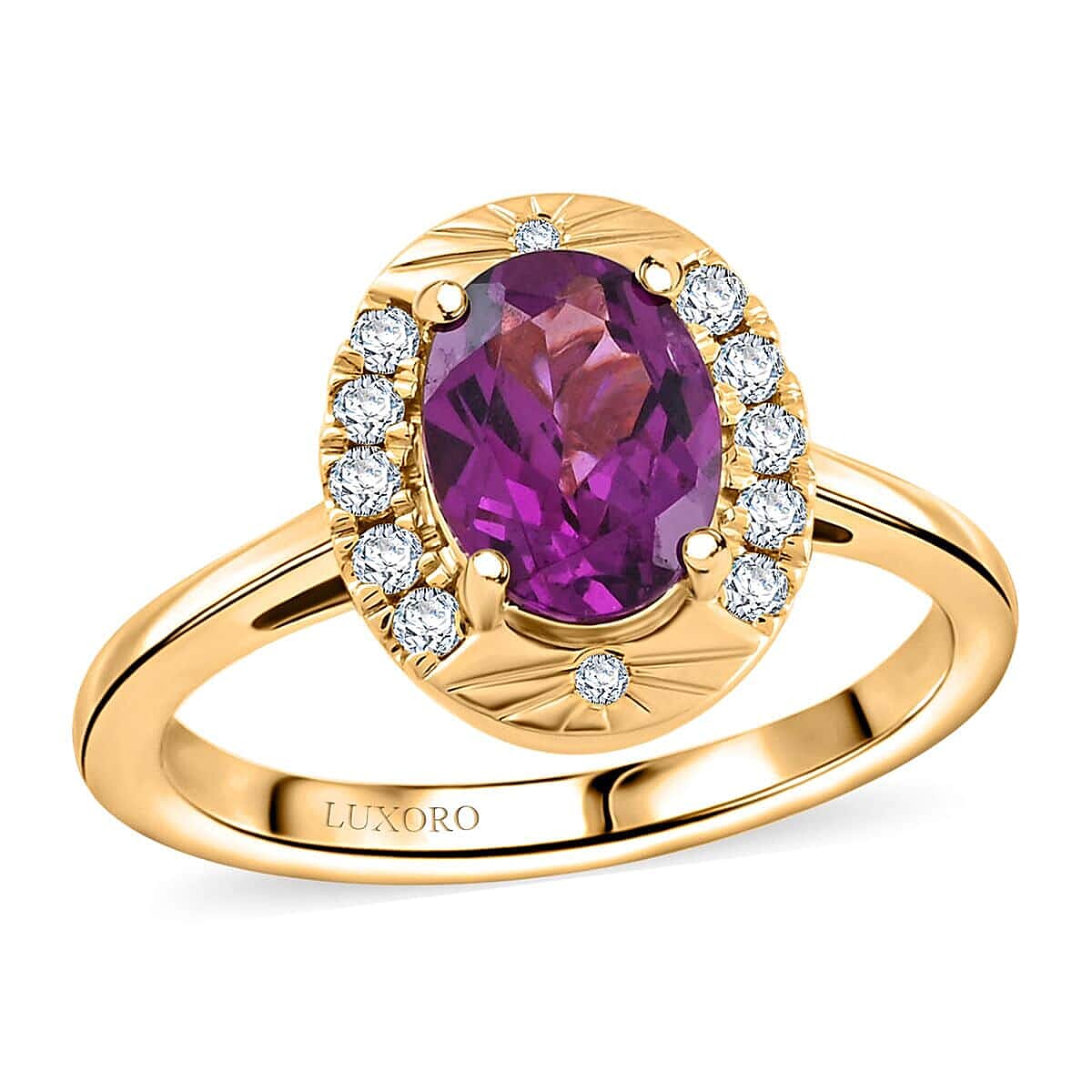 This Luxoro AAA Radiant ember garnet and diamond ring in 10K yellow gold is inspired by the halo design. Featuring an AAA-grade Radiant ember garnet, coveted for its rich hue, the gold ring is accented with diamonds.