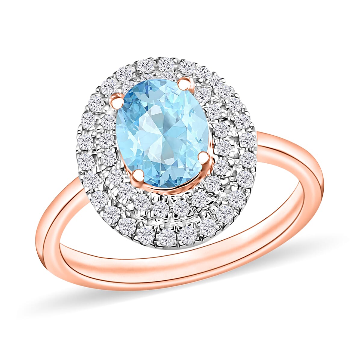 Luxoro Premium Mangoro Aquamarine and G-H I1 Diamond 1.60 ctw Double Halo Ring in 14K Rose Gold (Size 8.5) (Del. in 10-12 Days)