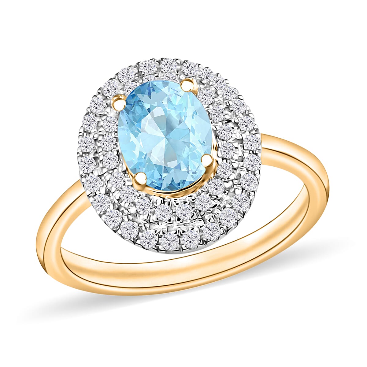 Luxoro Premium Mangoro Aquamarine and G-H I1 Diamond 1.60 ctw Double Halo Ring in 14K Yellow Gold (Size 10.0) (Del. in 10-12 Days)