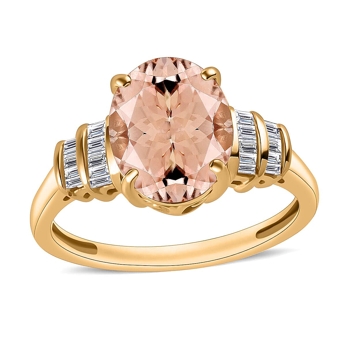Inspired by minimalism, this Marropino morganite ring for women redefines luxury with its simple and minimal design. It features a prong-set, oval-shaped morganite in the center with channel-set diamond baguettes on the shank, adding brilliance. The premium ring is customizable, allowing a selection of gemstone grade, carat weight, metal, and size, ensuring it meets individual preferences.