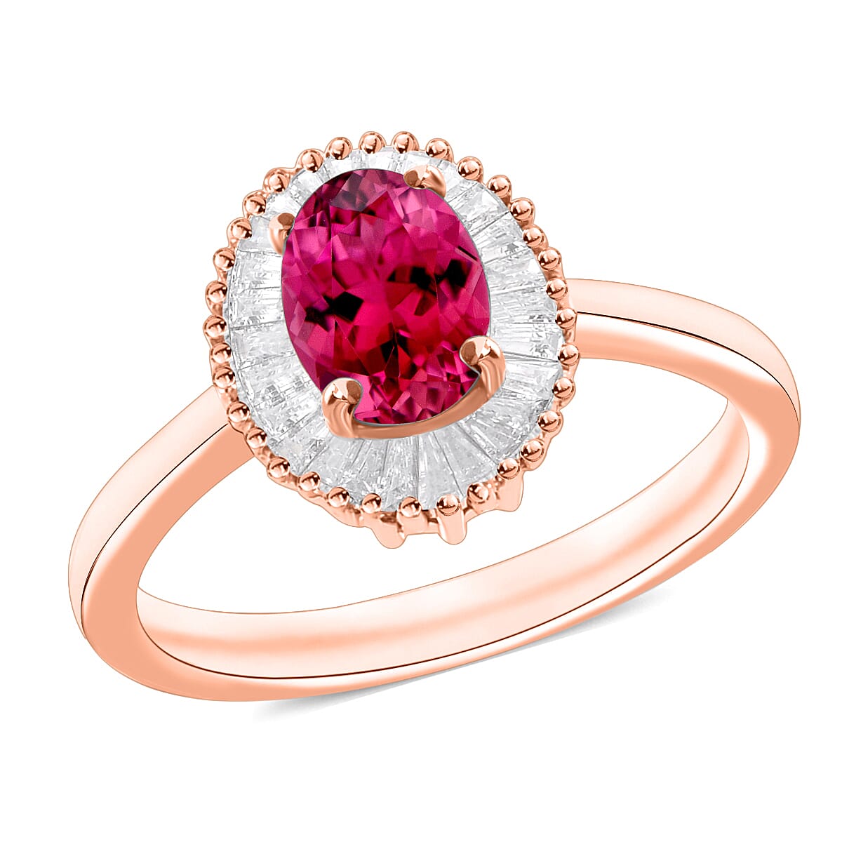 Flaunt elegance with this rubellite and diamond ring in premium metal. The rosy pink rubellite center radiates warmth, surrounded by sparkling diamonds. You'll cherish this custom ring as a symbol of timeless beauty and passion.
