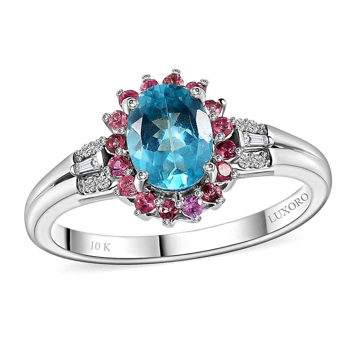 The Luxoro 10K white gold Madagascar Paraiba apatite and multi-gemstone ring features premium Madagascar Paraiba apatite, pink tourmaline, and diamond arranged in an elegant sunburst design. This gold ring captures the apatite's vibrant blue and pink tourmaline's warmth, creating a striking and timeless piece.
