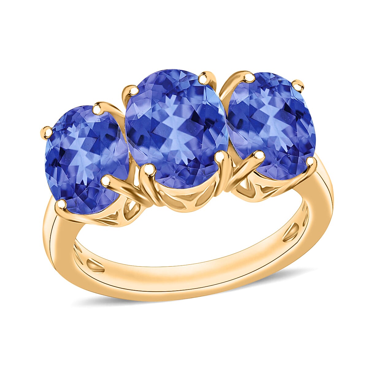 Dazzle confidently with this tanzanite three stone ring in durable metal. The trio of violet-blue gems creates a unique custom ring design. You will cherish how this elegant tanzanite jewelry complements your sophisticated style.