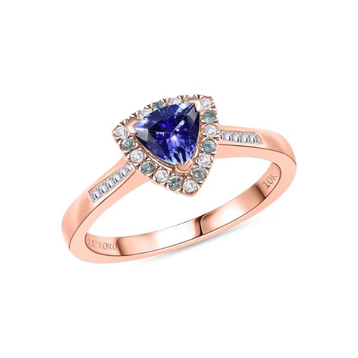 Capture romance with this Luxoro tanzanite and diamond ring. The trilliant tanzanite glows in the middle of a sparkling diamond and tourmaline halo. Crafted in 10K rose gold, this premium halo ring is designed for all occasions.