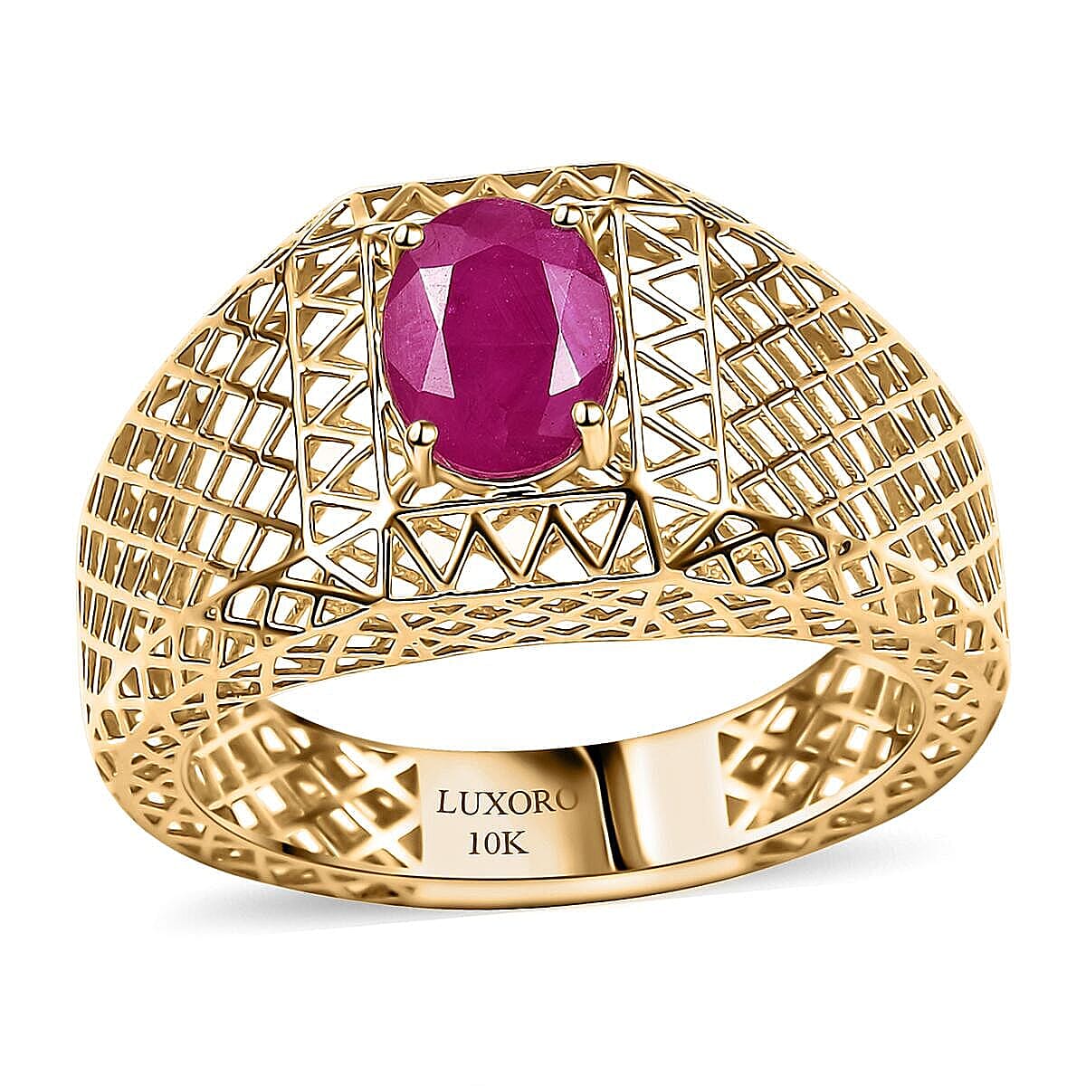 Discover the timeless elegance of the Mirage Collection's royal ruby men's ring. Set in lustrous 10K yellow gold, this cross cross pattern on the shank reflects a sense of luxury and status. Perfect for those with a refined taste, this 10K gold ring symbolizes sophistication and individuality.