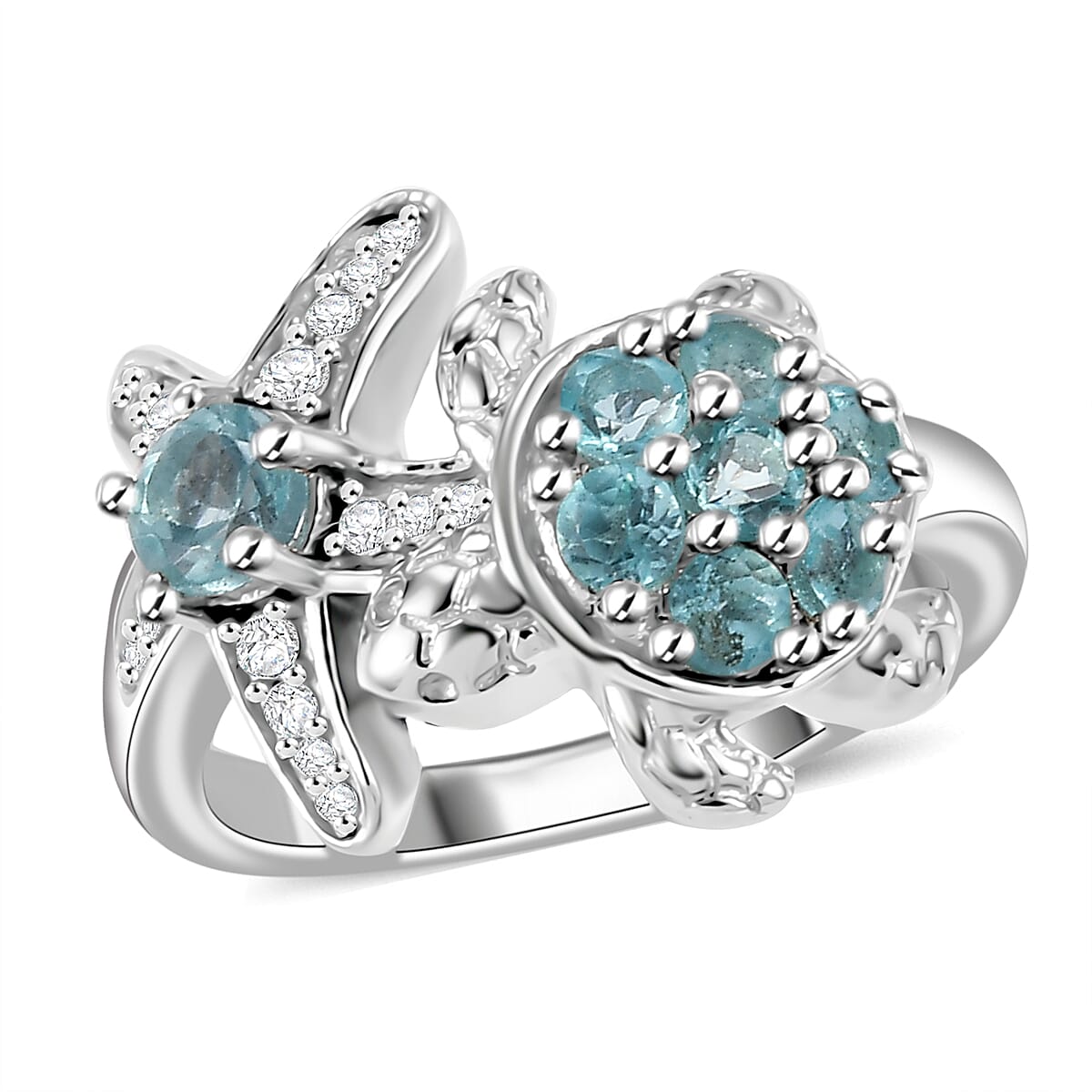Madagascar Lagoon Apatite and White Zircon 1.00 ctw Turtle Starfish Ring in Rhodium Over Sterling Silver (Size 9.0)