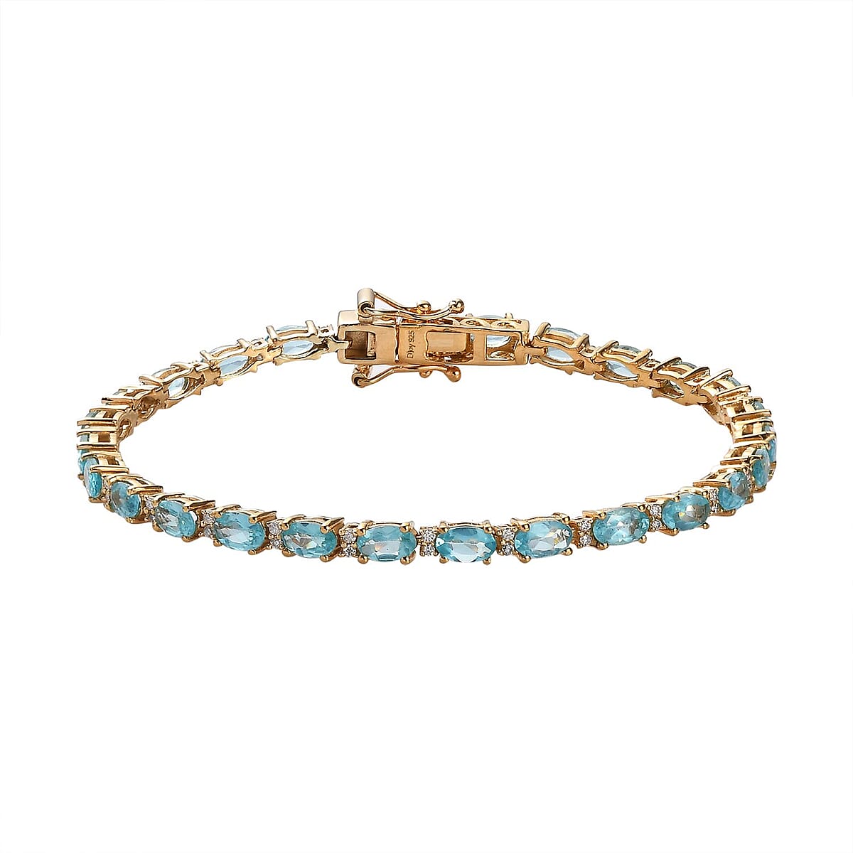 Welcome to the world of opulence with the Madagascar Paraiba apatite and moissanite tennis bracelet adorned in vermeil yellow gold over sterling silver. The rare apatite stones paired with dazzling moissanite create a sea of tranquility and a sky full of stars around your wrist, bringing harmony and unparalleled brilliance to your style.