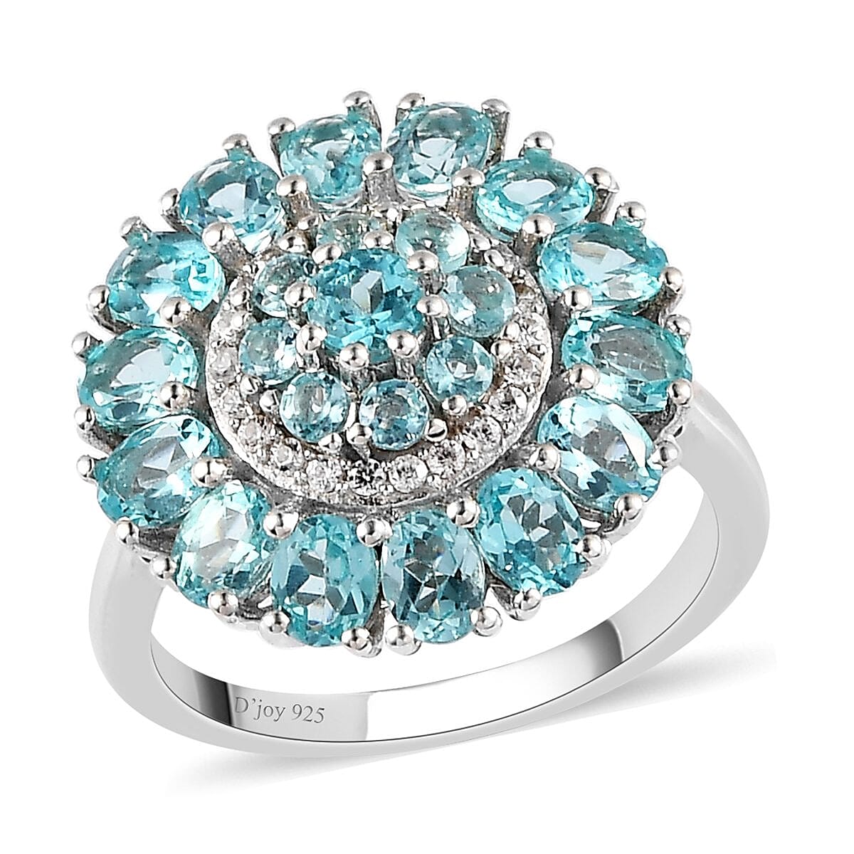 A perfect fusion of floral and cocktail design, this Madagascar Paraiba apatite ring gives a stunning appearance. This beautiful stone is known for its vibrant blue color. These stones are highly sought after and look amazing in this sterling silver crafted ring. This Paraiba apatite cocktail ring features a cluster of round gemstones in the center, highlighted by white zircons. The oval-shaped apatite encircles the center design giving a floral look. This Paraiba apatite floral cocktail ring is perfect for a statement piece that combines natural beauty with elegance and style.