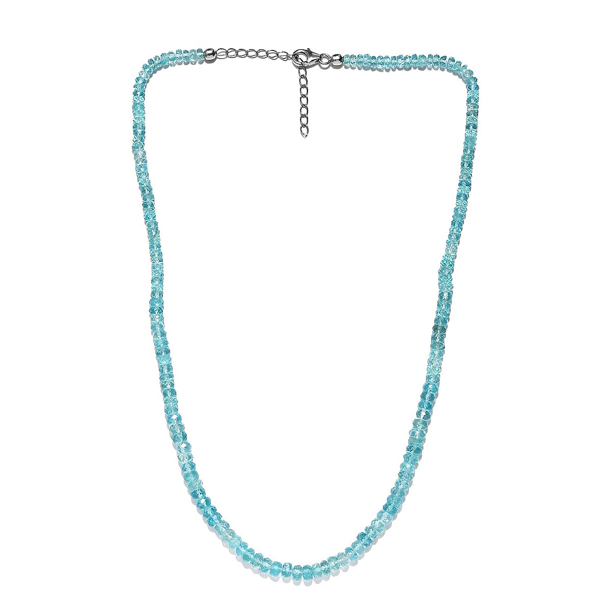 With an electrifying appeal, this soothing-toned Madagascar Paraiba apatite beaded necklace will surely charm your look. This necklace features single strand of fancy-shaped Madagascar Paraiba apatite beaded chain. The colors of Madagascar Paraiba apatite are rare and beautiful bluish-green, signifying the allure of the island of Madagascar off the coast of Africa. Perfect for adding a little bling to your wardrobe staples like plaid shirts or sheer scoop-neck tanks. This princess-length necklace features rhodium-plated sterling silver crafting and lobster clasp closure.