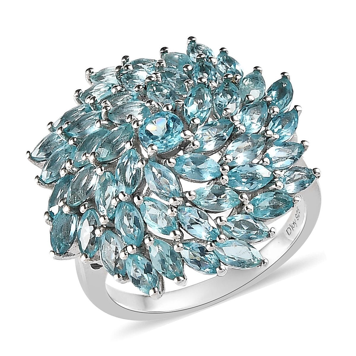 Unveiling a riot of color and sparkle, this Madagascar Paraiba apatite ring is an enchanting tribute to the radiant hues of nature. The cluster ring design features marquise-shaped apatite stones dramatically arranged around a central round apatite, creating a floral allure. Set in sterling silver, the prongs lend a beaded look, enhancing the mesmerizing design of this apatite jewelry piece.