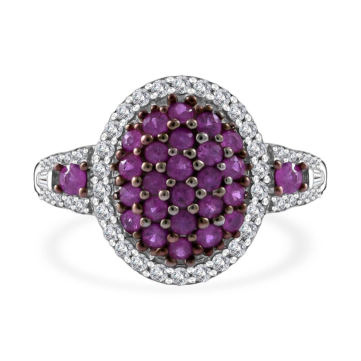 Madagascar Pink Sapphire and Moissanite Cluster Ring in Rhodium Over Sterling Silver (Size 6.0) 1.10 ctw