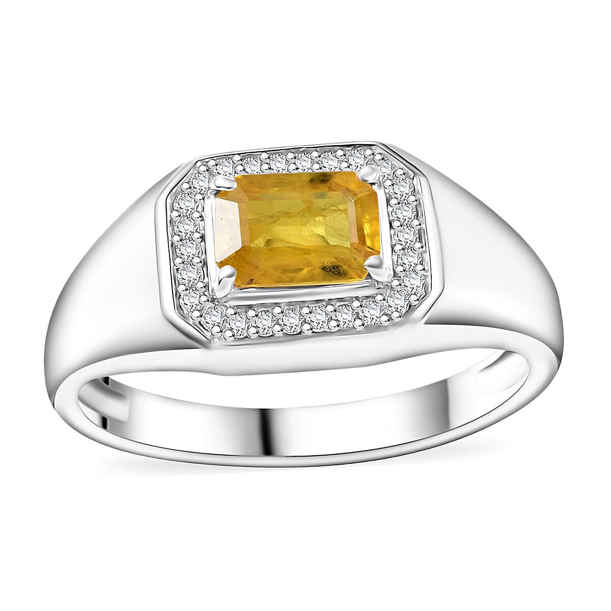 This Madagascar yellow sapphire and moissanite ring is inspired by the halo design. The Madagascar yellow sapphire, coveted for its vibrant hue, is encircled by moissanite for a striking contrast. Crafted in sterling silver with a premium finish, all gemstones are securely set in prong settings for lasting security.