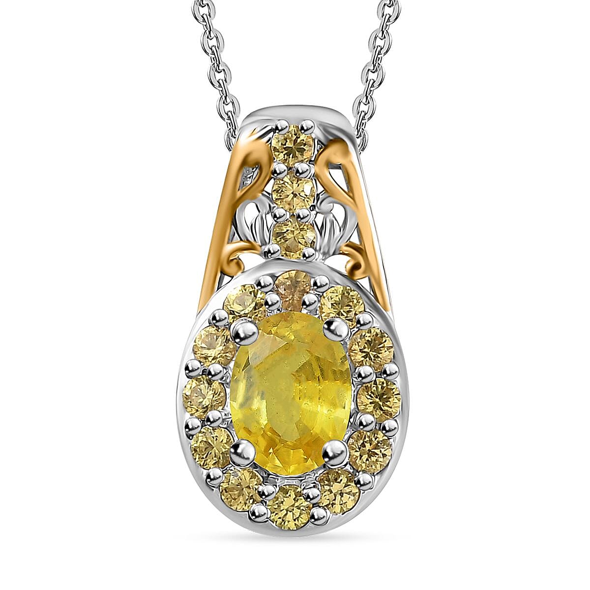 Madagascar Yellow Sapphire Halo Pendant Necklace 20 Inches in Vermeil Yellow Gold and Platinum Over Sterling Silver 1.60 ctw