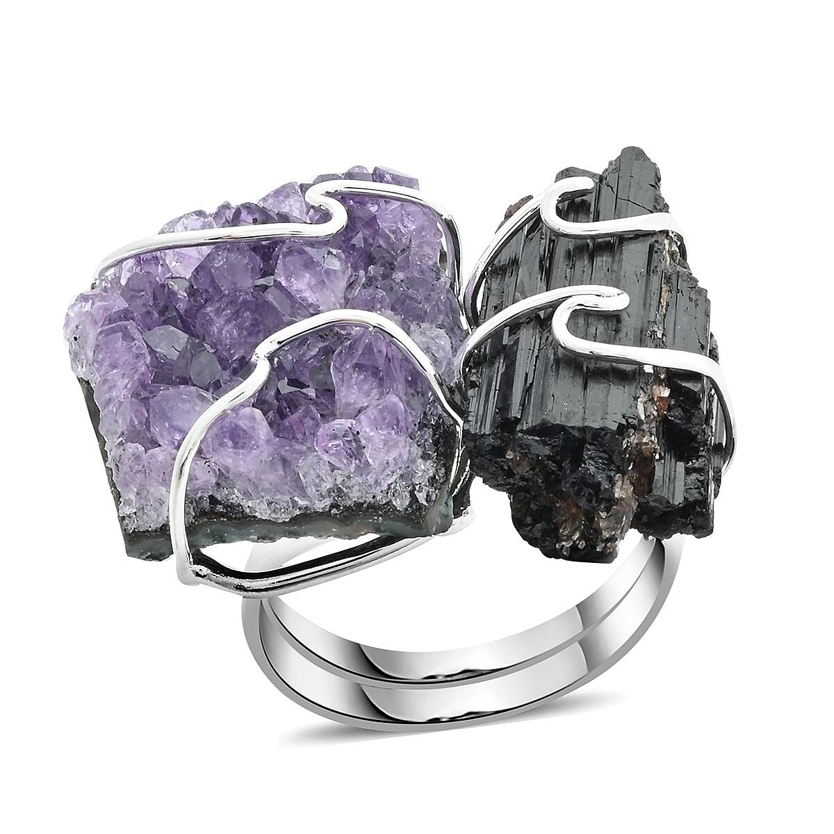 Immerse yourself in a dance of color and design with our amethyst and tourmaline ring. Symbolizing the union of two souls or dual aspects of self, this ring, cast in sleek silvertone, is an ode to nature and love's intertwined destinies.